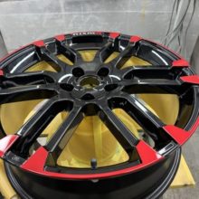 こちらのホイールを、ブラック部分はそのままに外周のダイヤカット部のみを特注カラーのニスモレッドで部分塗装します。そんなわけで塗料取り寄せました。