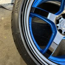 藤沢市のお客様からのご依頼です。養生マットに置いてあるフロントホイールが色見本で、リアホイールが違う色で傷だらけだったので修正と同色塗装を行いました。